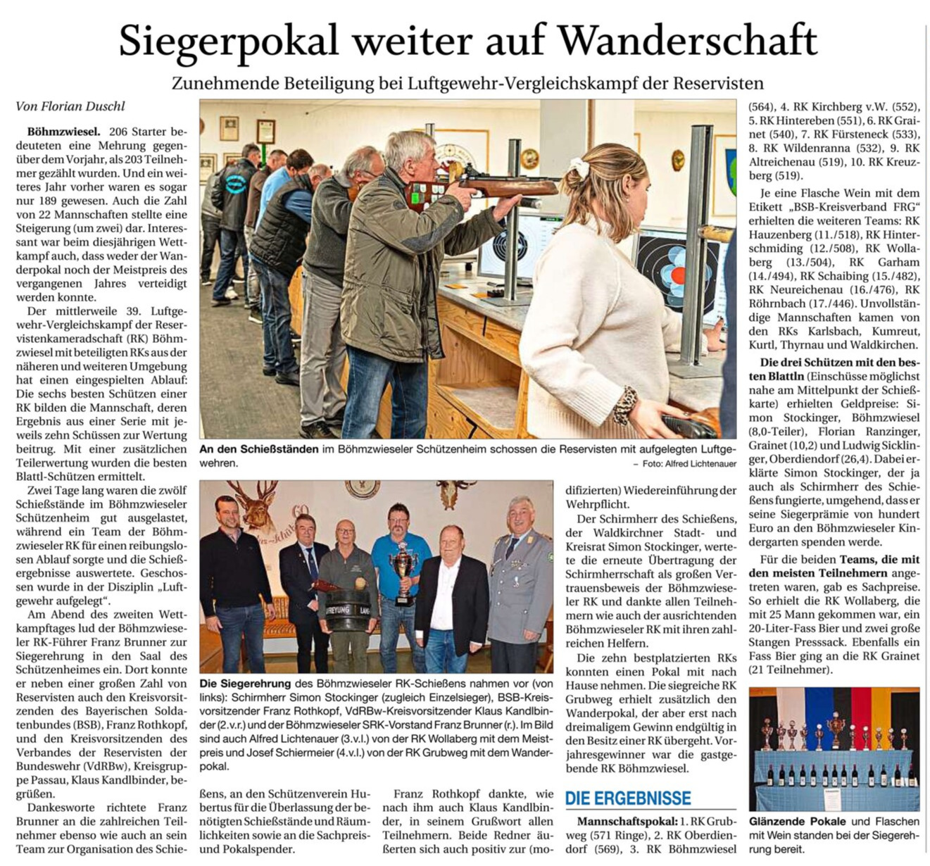 Beim Luftgewehrvergleichskampf im Böhmzwieseler Schützenheim konnte die Reservistenkameradschaft erneut eine steigende Beteiligung verzeichnen. Mehr als 200 Schützinnen und Schützen aus zahlreichen Reservistenkameradschaften der Region nahmen am traditionsreichen Wettkampf teil. Der begehrte Wanderpokal bleibt weiterhin auf Wanderschaft, nachdem es auch in diesem Jahr keiner Mannschaft gelang, den Titel aus dem Vorjahr zu verteidigen. Der mittlerweile fest etablierte Vergleichskampf bot über zwei Wettkampftage hinweg spannende Entscheidungen und kameradschaftlichen Austausch.